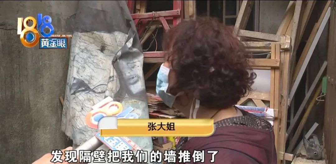 张大姐:“三年前我过来,发现隔壁把我们的墙推倒了,往我们这里移了,占用了面积,搭了一个厨房,是吧,影响我们的采光了,往高处搭了,把我们的采光挡住了,我当时跟他讲过的,房东讲过的,你不应该这么高的,采光不要挡住我们。”