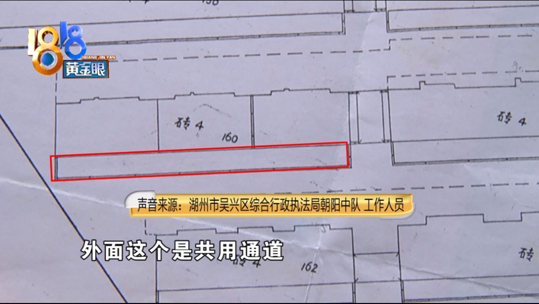 湖州市吴兴区综合行政执法局朝阳中队 工作人员:“房产证上面就看到是她房间里面的面积,就是房间里的面积,外面没有的,外面这一块没有的,这个是(二楼)阳台,(现在)墙就在这个位置,土地证的话可以看得到这是160幢,外面这个是共用通道 (围墙)隔开的话都是原先的,这个房子是1984年到1986年建造的,当时可能这个院子居民都是自己多占点面积,自己建起来的,大姐这个我也是跟你讲了,这个还是协商为主。”