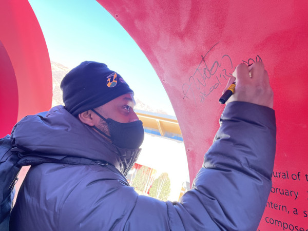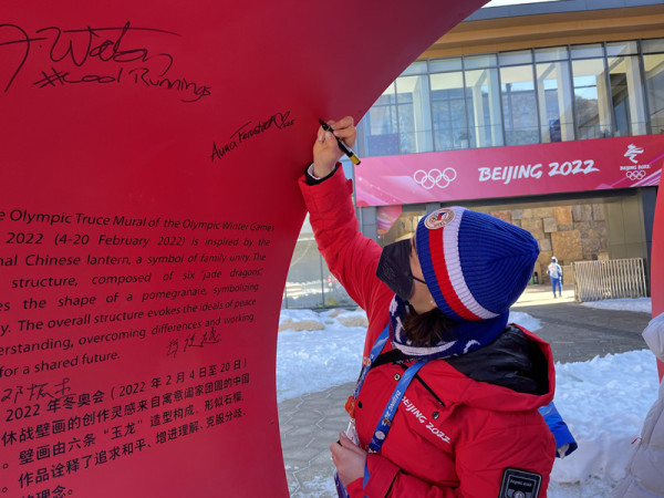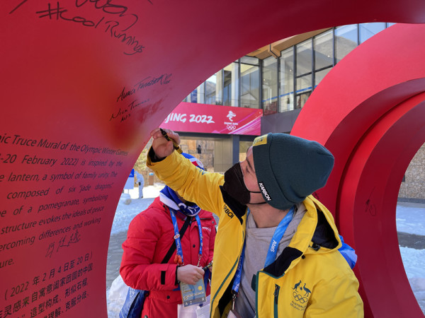 在休战墙前,冬奥会刊看到,多个代表团运动员慕名来到墙体前签上自己的名字,表达自己对和平、团结的美好愿景。