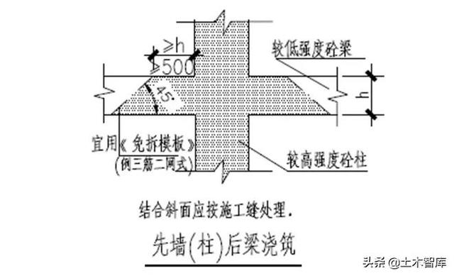 采用钢板网(简易收口网)垂直栏设在节点处,距高强度等级混凝土的墙柱边500mm处,高低不同强度等级混凝土同步浇筑。