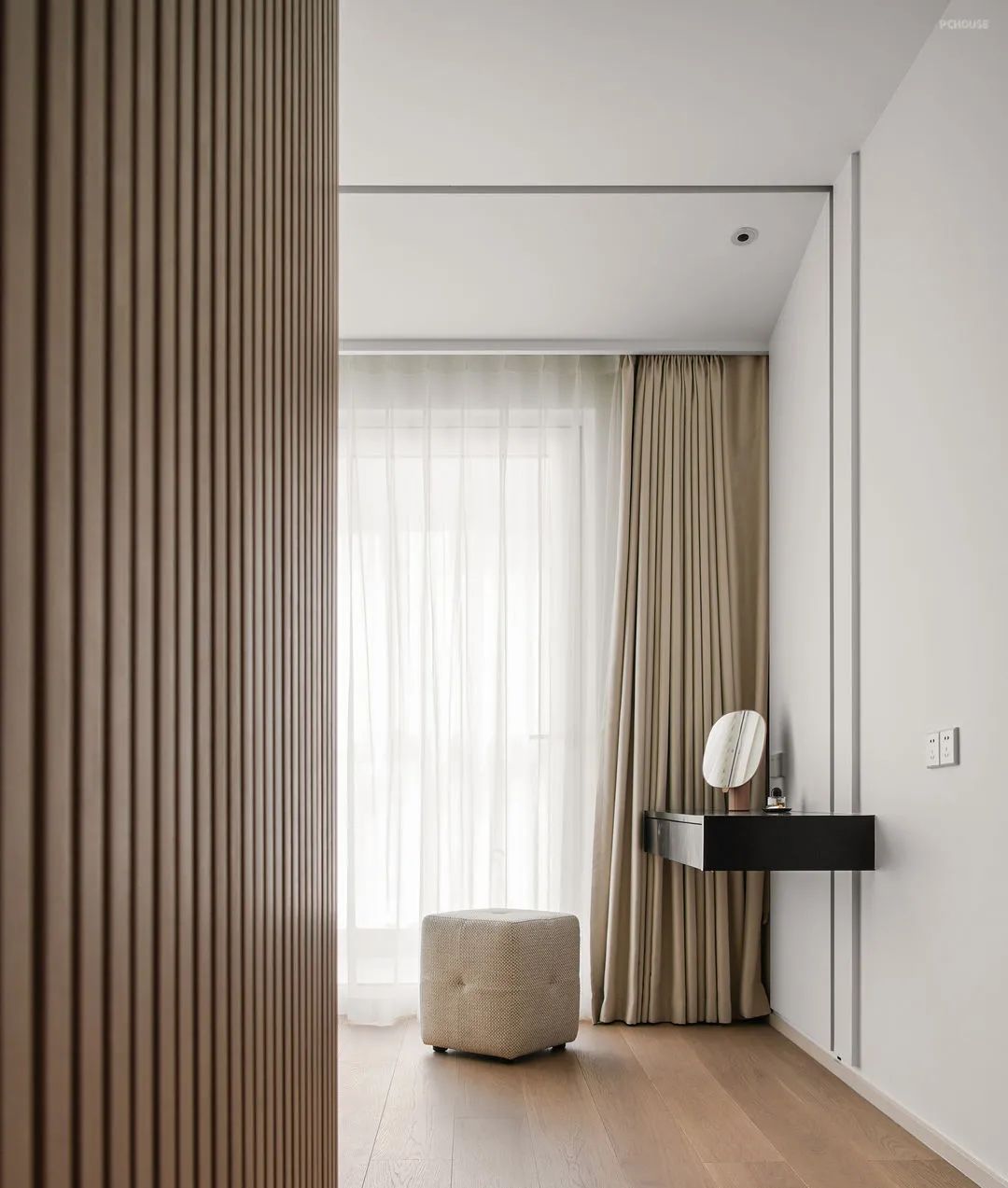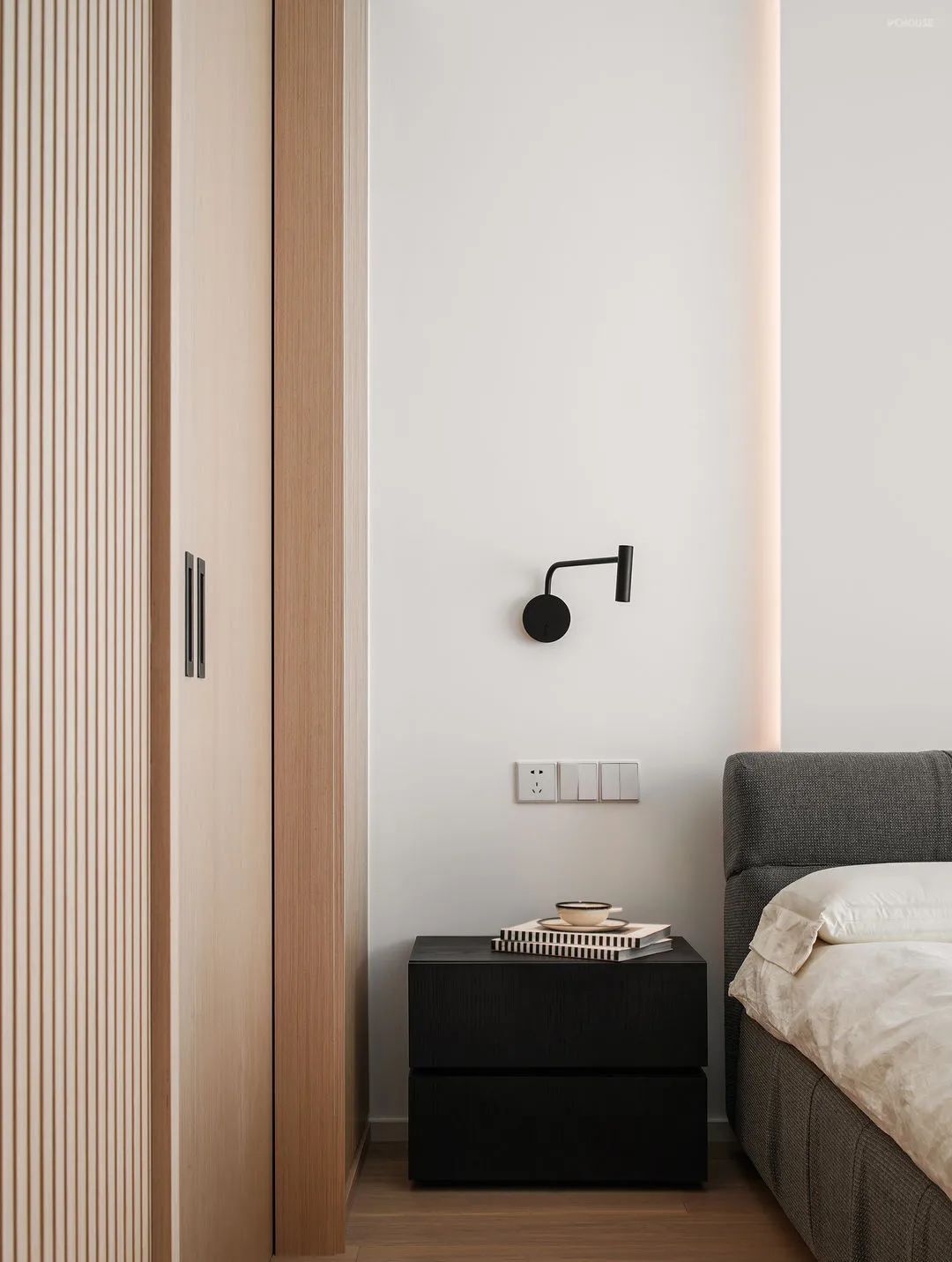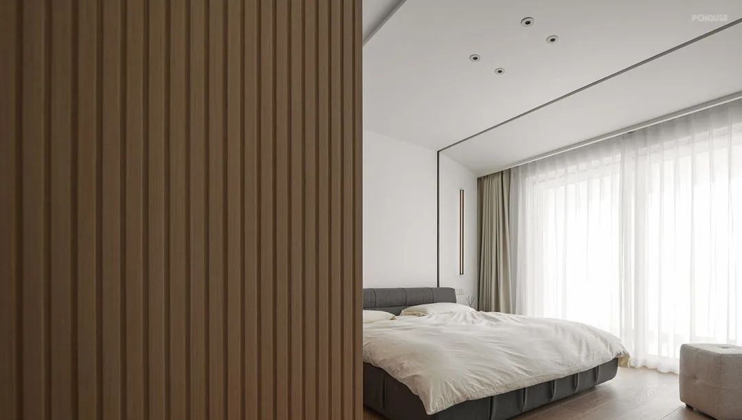 以白色和木色两种简单的材质来表达整个卧室空间的安静、平和,加以强烈的线条感来进一步刻画细节轮廓。
