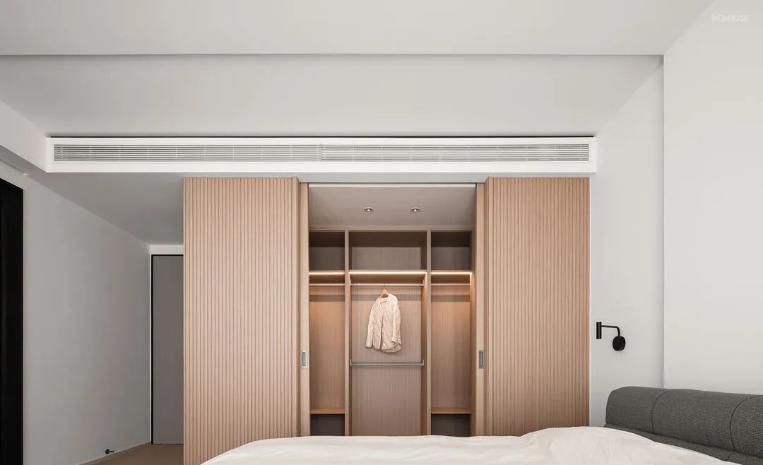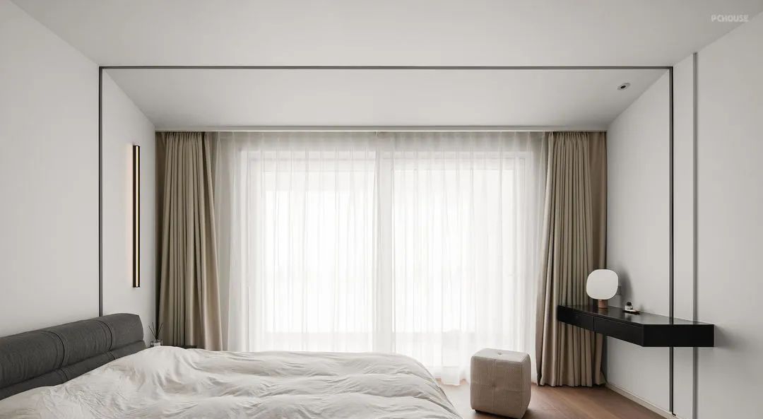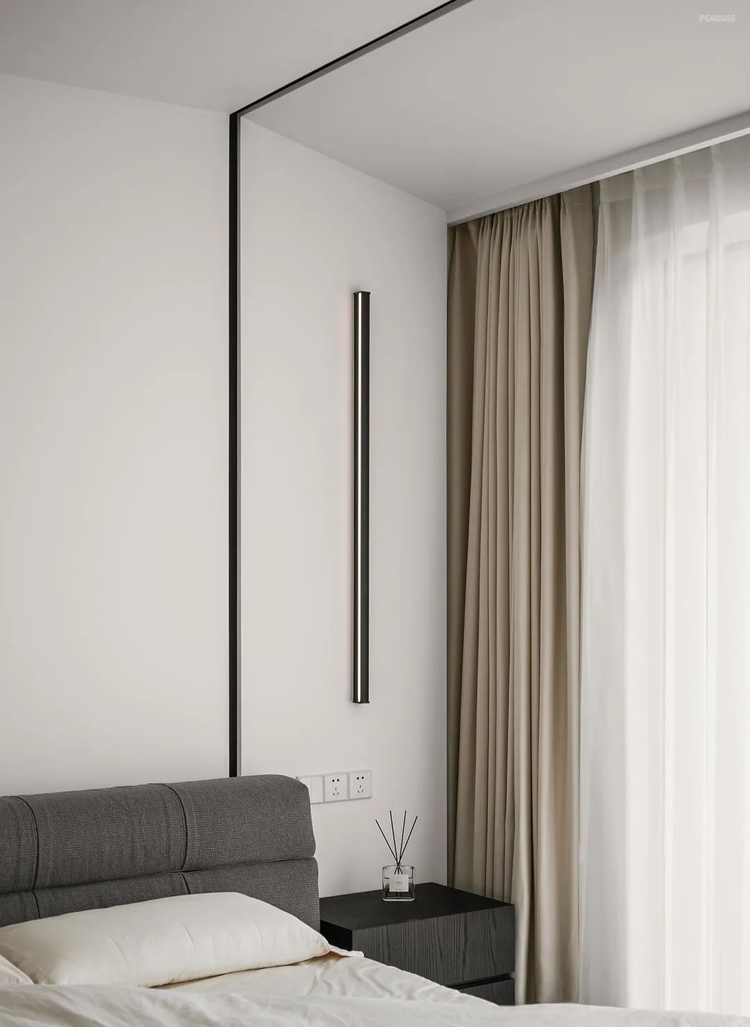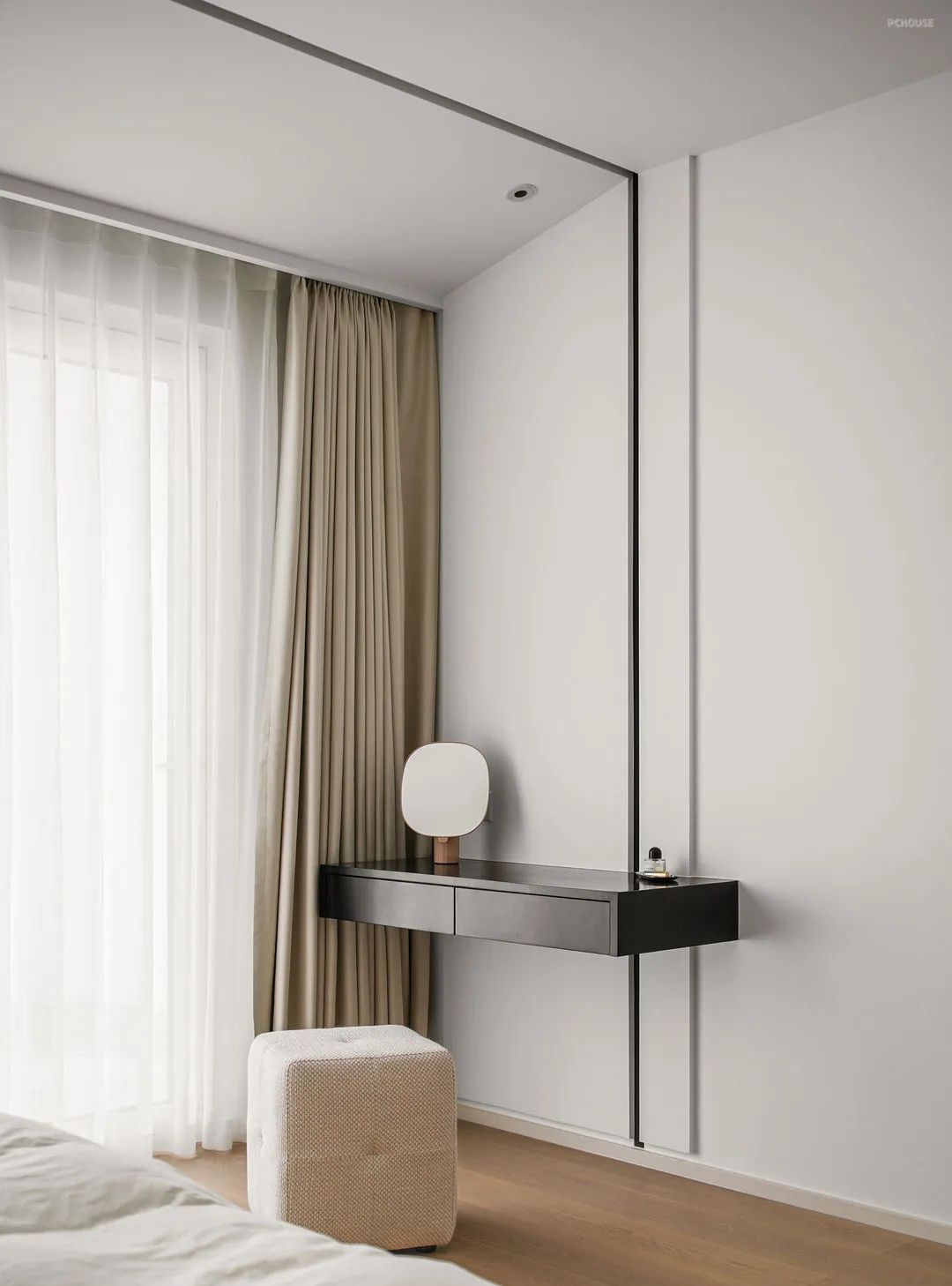 以白色和木色两种简单的材质来表达整个卧室空间的安静、平和,加以强烈的线条感来进一步刻画细节轮廓。