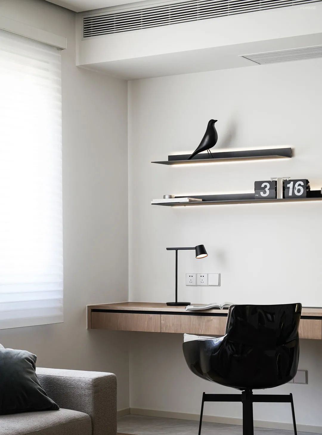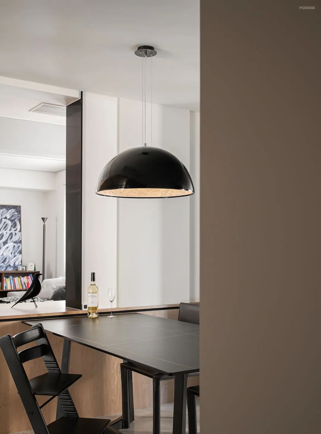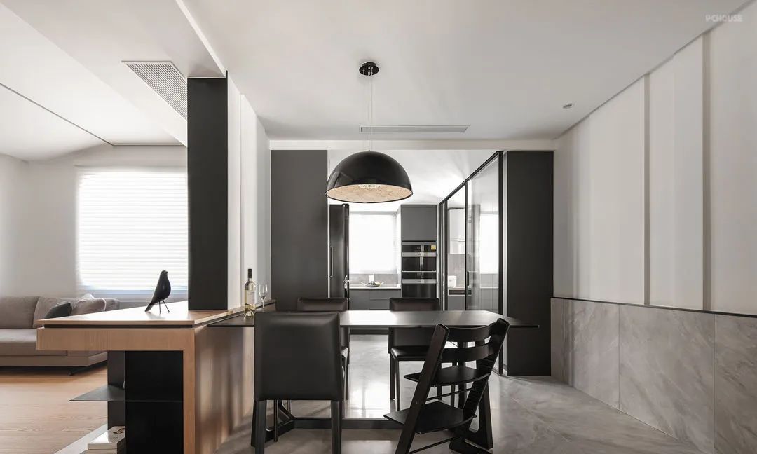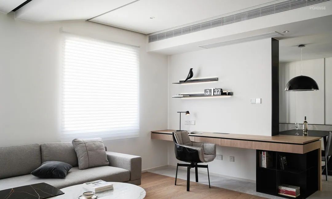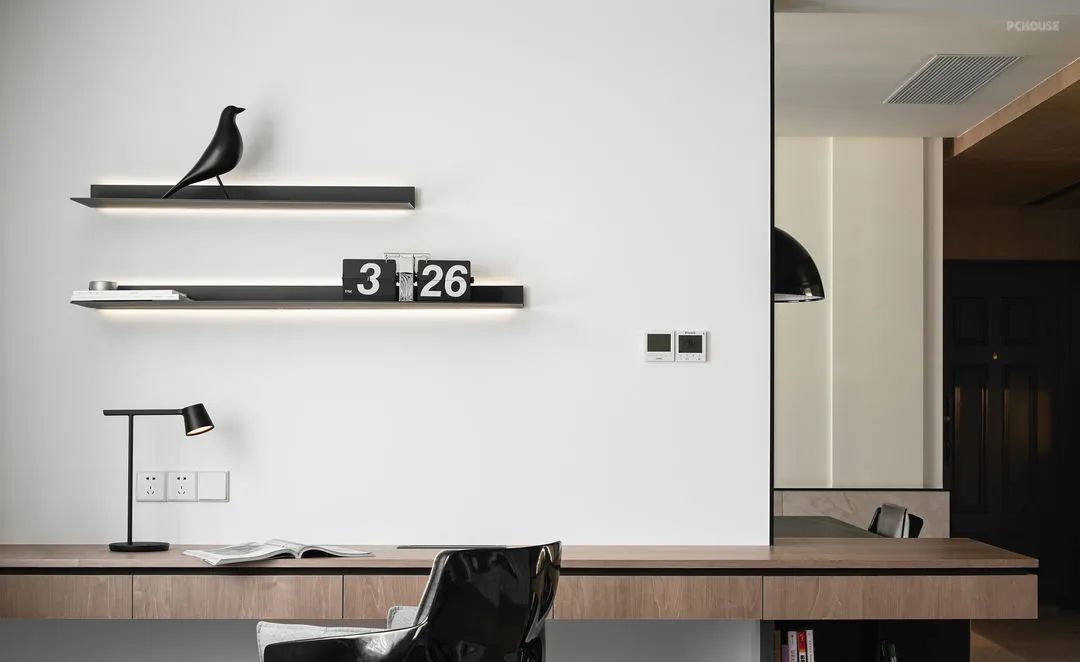 原有承重墙体阻隔了客、餐厅,产生了生硬的空间关系。为满足屋主的轻度办公使用,将书房置于客厅一侧,将水平面向餐桌延伸,起到整合多样功能、模糊空间界限的作用。