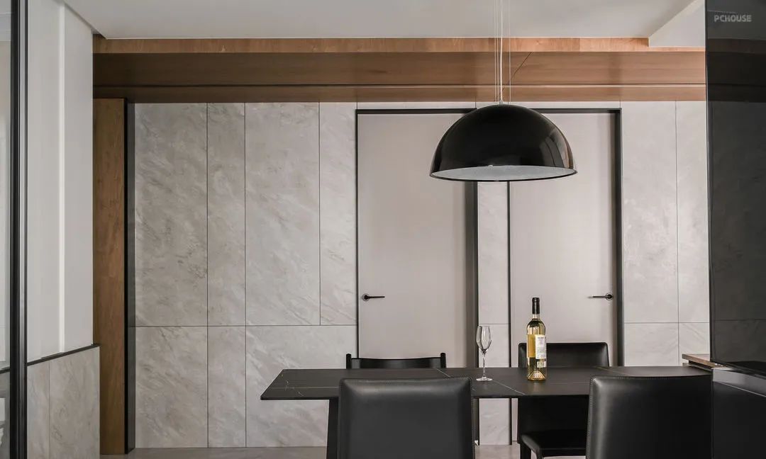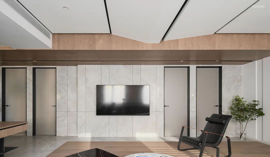 空间为表达简洁明快的视觉,材质的使用上追求连贯而分明。墙面温润的石材纹理,顶面天然的胡桃木纹,划分了空间主要的两个块面。