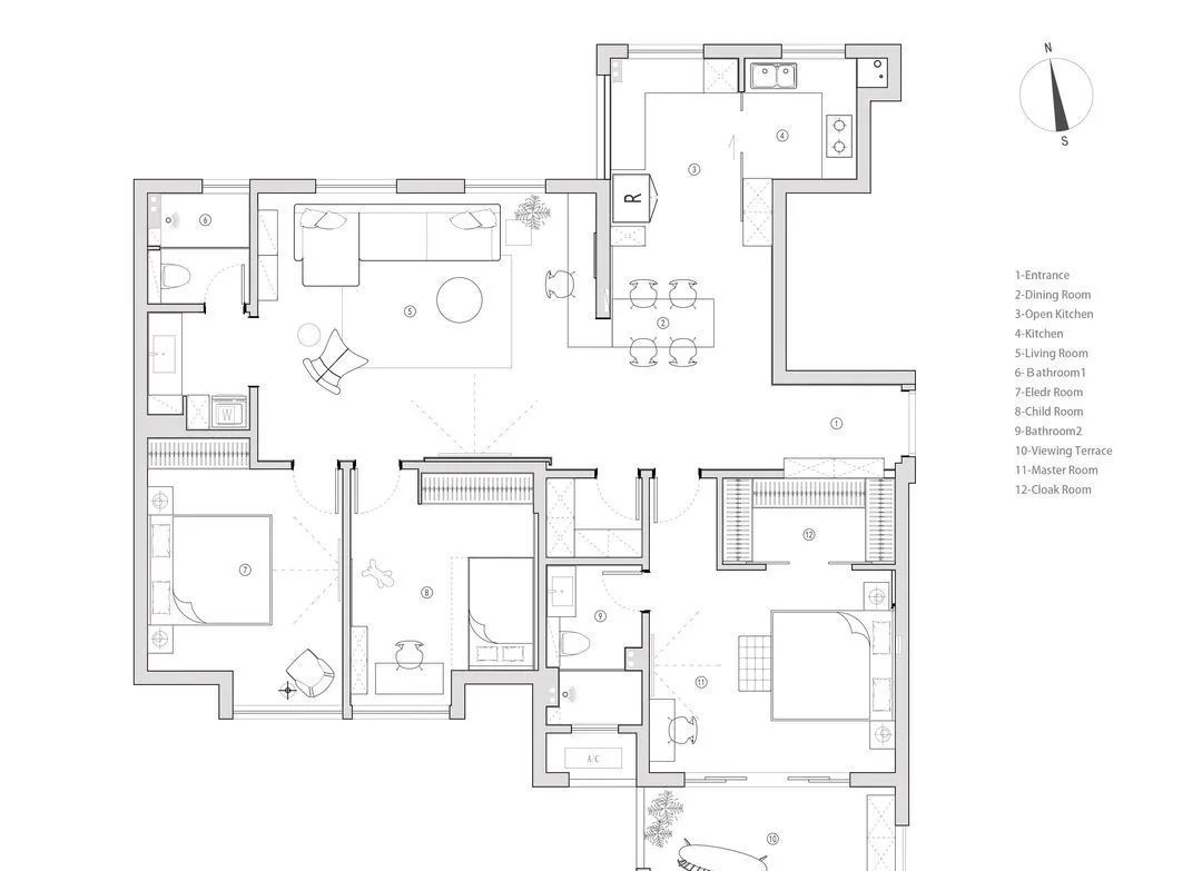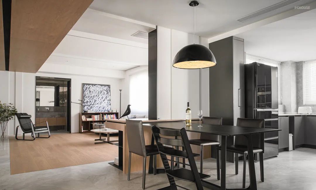 该项目是位于杭州市的150平米公寓,方案中最大的改动是将北面采光较差的两间客房墙体拆除,融合过道空间后形成宽敞方正的空间体量,同时通光量也大幅提升。