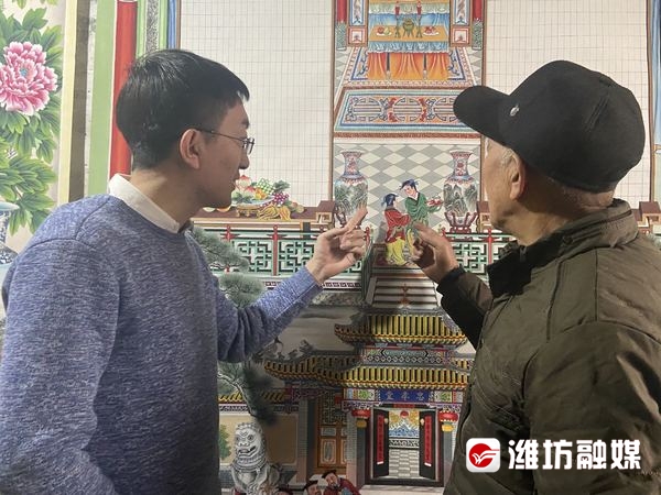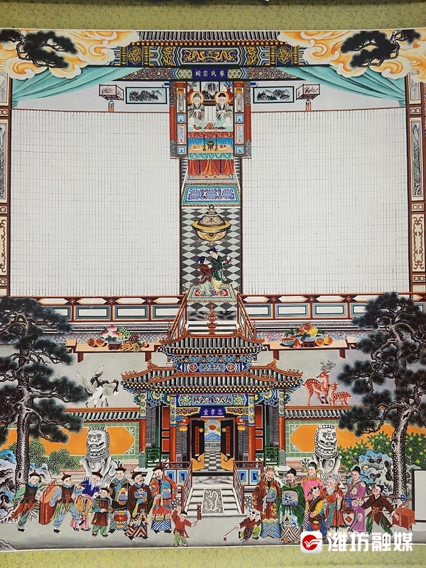 对于王世忠的家堂画作品,昌邑市非遗理论研究爱好者林鹏飞有着独到的见解。他认为,王世忠的家堂画融合国画和古建筑绘制技法,都是以山水画为主。正殿和内殿是工笔绘制画面,融合的是传统年画技艺,整体画面色彩庄重大气、艳丽。“画中的松柏代表的是四季长青,画中人物面目圆润丰满,代表的是福气满满。老人在前,小孩在后,展现的是为长者尊、为少者孝,长幼有序,呈现出家庭兴旺的一种美好景象。”林鹏飞介绍,王世忠家堂画的下半部分,主要是展现后代进祠堂去拜祭祖先的场景,呈现的是一种家风的传承,一般在庙门上都有一幅对联:“忠厚传家远,诗书继世长”,展现的是耕读继世、忠厚传家的思想。