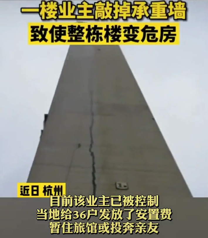 近日,网络上流传的一则视频引起网友注意。视频中称,杭州某公寓一楼业主敲掉承重墙,致使整栋楼变危房。从视频画面中可以看到,楼房外墙有一条长达数米的明显裂缝。