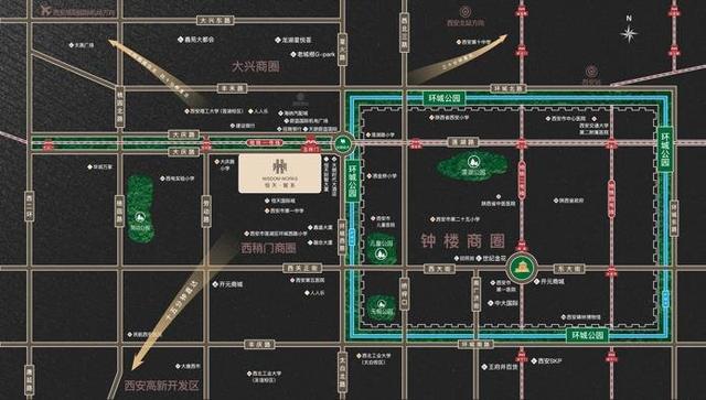 项目北邻老城根G-park、龙湖星悦荟,南接中大国际、王府井百货、西安SKP等高阶商业;同时,环城公园、莲湖公园、劳动公园三大公园环绕,享受不可多得的绿意生态大境。