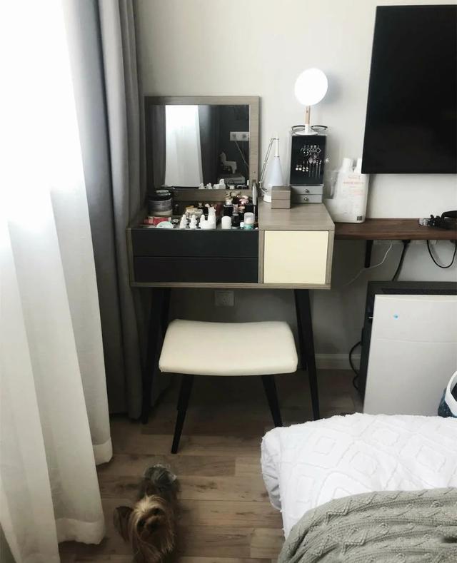 过道尺寸较小,所以屋主在淘宝上找了一个只有70cm宽的两用梳妆台,有一个大抽屉配两层薄抽屉,梳妆台放下桌盖就可以当电脑桌,这样晚上玩电脑就不用去次卧了。
