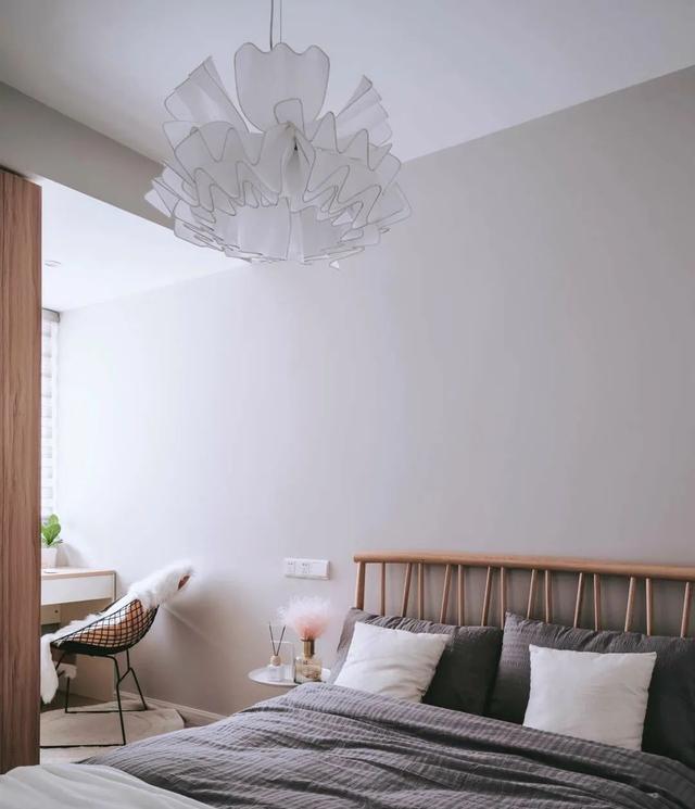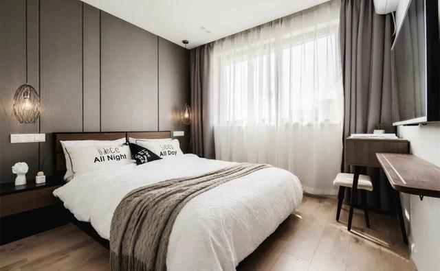 主卧的光线很好,简洁明亮。背景墙选择了灰色硬包,窗帘配合主色调选择灰色。