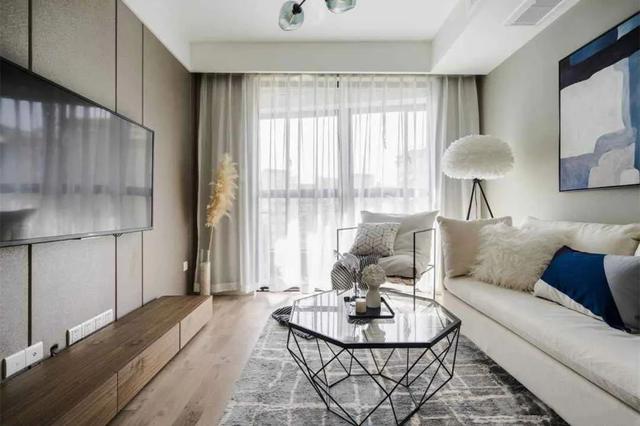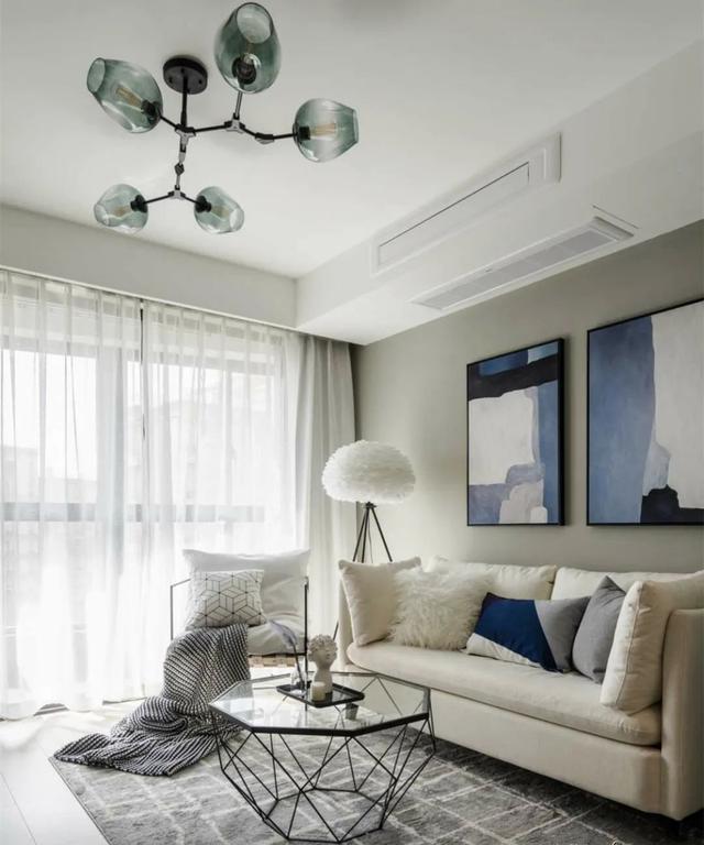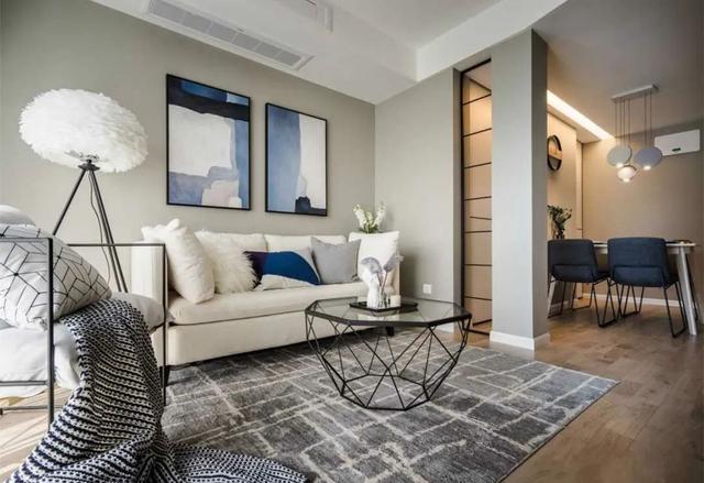 客厅整体颜色是黑白灰,白色为主,打造一个白色系的世界,干净、平和。灰色墙面刷的是立邦浅灰色乳胶漆。