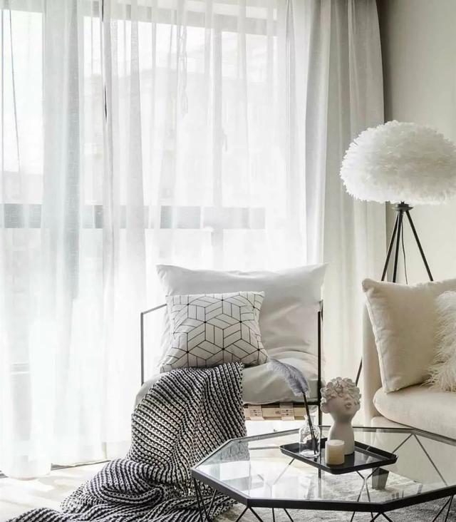 阳台没装遮光帘,屋主把白纱帘先挂好后,觉得装修到这里也很美,和白色系世界十分搭,一直沿用到现在。