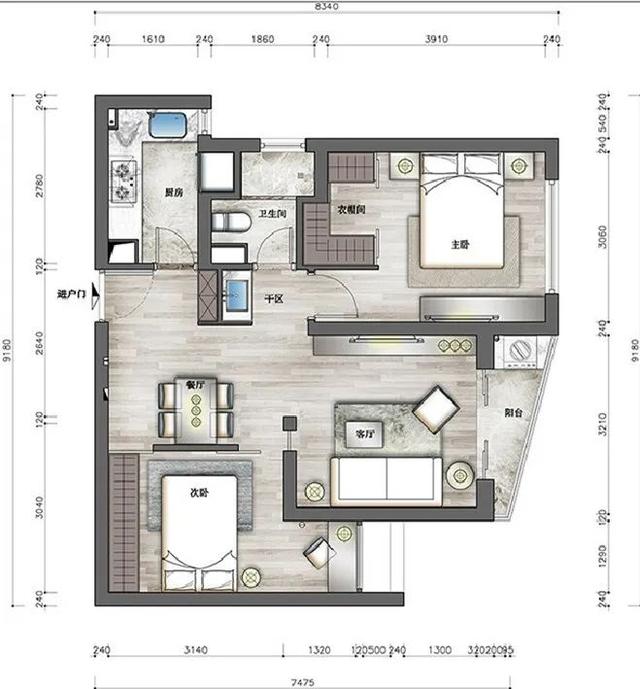 把次卧的房间墙往里推,让餐厅扩大;卫生间干区外移,三分离的同时,用干区墙做隔断,满足玄关鞋柜功能,遮挡入户视线,保证隐私;厨房向卫生间借用一块凹形空间,用来放下冰箱。-