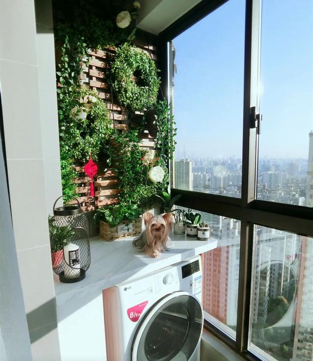 阳台不大,但胜在视野开阔,能看清陆家嘴三件套。屋主把其中一面墙打上了木栅栏,然后配上仿真绿植,因为自己不太擅长种真绿植。角落里塞下洗衣机,方便晾晒。