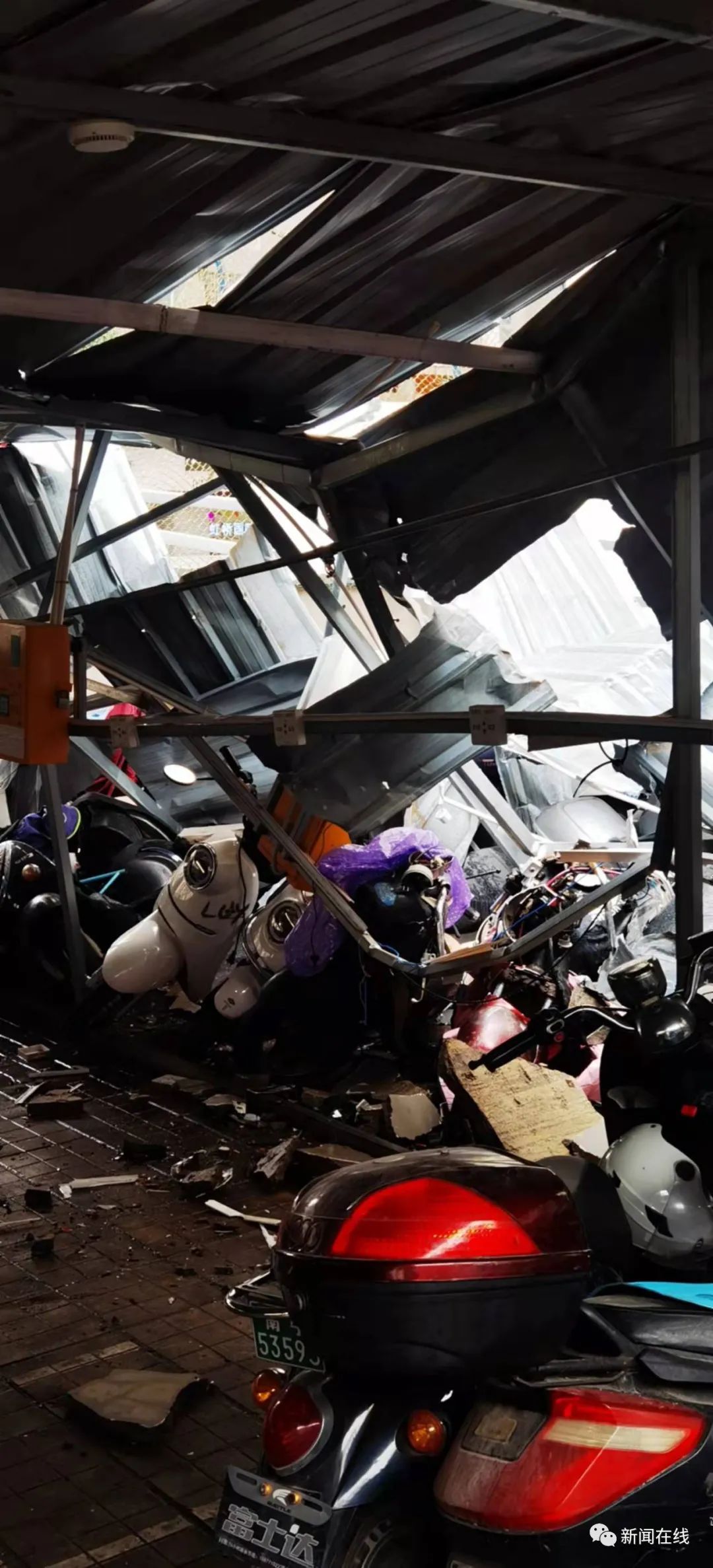 记者了解到,20栋与21栋之间的电动车停车场也在这次意外中遭了殃,挡雨棚被砸得扭曲变形,多辆电动车被砸得面目全非。