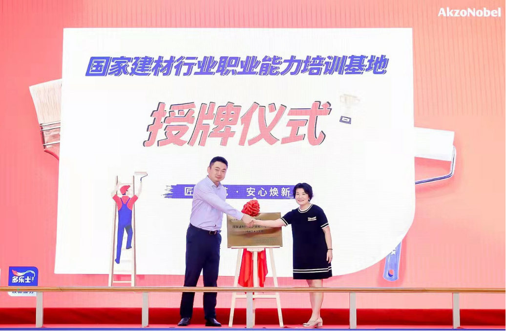 值得注意的是,在本次大赛现场,中装材建涂分会还为多乐士学院进行了正式授牌。授予阿克苏诺贝尔漆油(上海)有限公司“国家建材行业职业能力培训基地”资质,标志着在“墙体艺术涂装师”的技能培训领域,阿克苏诺贝尔的多乐士学院已经达到了专业技能培训的标准,处于行业先行地位。