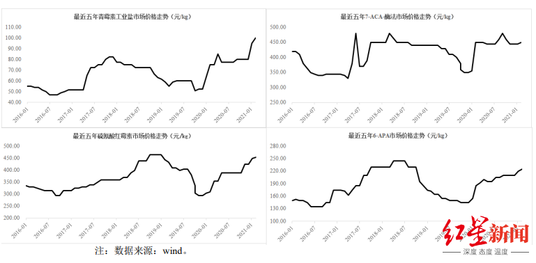 国盛证券曾在研报里指出,川宁生物所涉猎原料药,如硫氰酸红霉素、7-ACA、6-APA的价格,2019年中旬进入一个下行通道。尤其是硫氰酸红霉素,价格从2019年初的465元/公斤探底至295元/公斤。叠加川宁生物在大规模投产,从而造成业绩缩水。而自2019年12月以来,硫氰酸红霉素价格开始逐渐回升,同期川宁生物的业绩也有所好转。