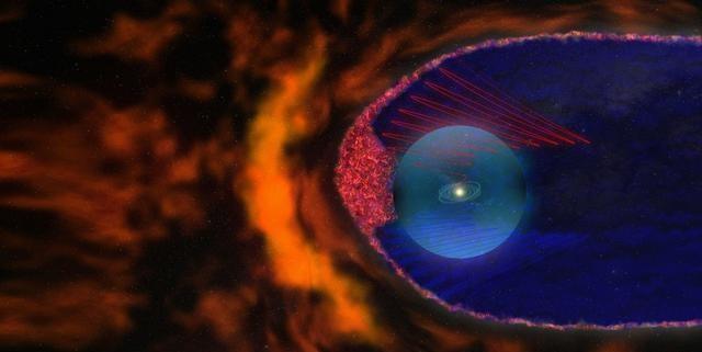 在这个日鞘的周围,太阳所发射的太阳风与来自太阳系外的外太空辐射发生猛烈碰撞,能量迅速聚集,温度最高可达49420摄氏度。