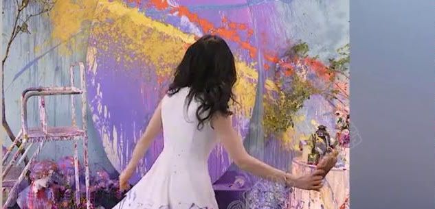 为了达到人画合一的境界,她想到了与画融为一体的办法,用桶泼颜料就相当于叮叮与画板的对话。