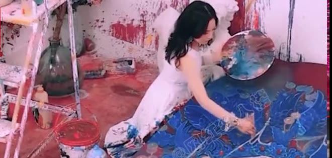 为了突破常规自成一派,也为了视频流量,叮叮一条站在高处大胆泼洒颜料的视频,在获得几十万点赞后,叮叮拍摄风格绘画基调基本定型。
