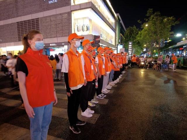 傍晚5点40分,劳拉穿上志愿者红马甲,先跟女子巡逻队在湖滨步行街巡逻。