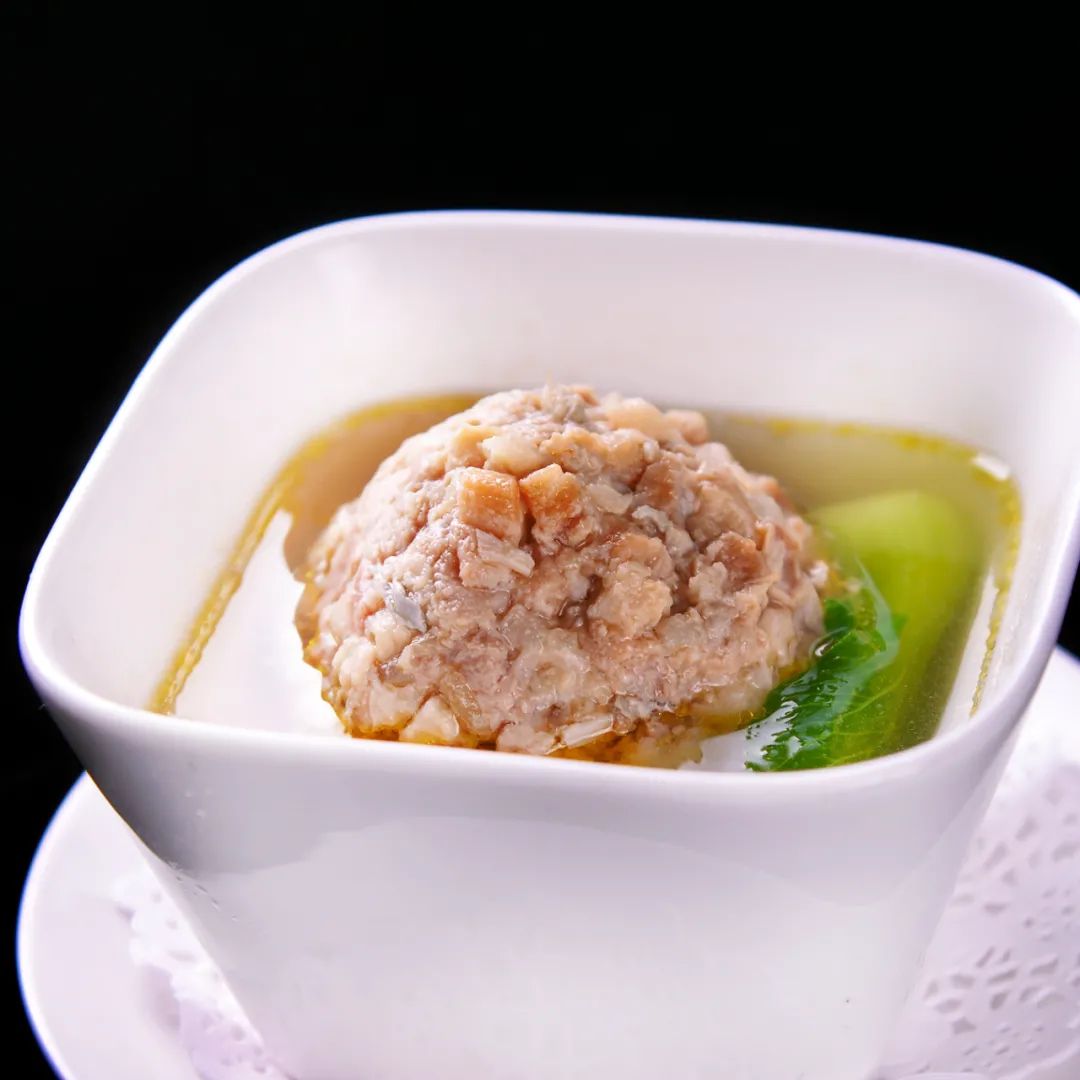 这道蟹粉狮子头,选取上好的猪肉,按季节配比瘦肉和肥肉的比例,刀切成粒,手打上劲,加盐和新鲜的蟹粉,放入高汤中细火慢熬8小时而成,吃起来口味浓郁,香气醇香。