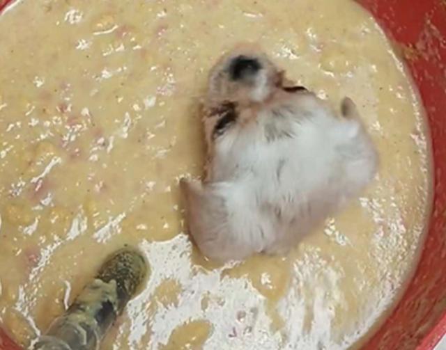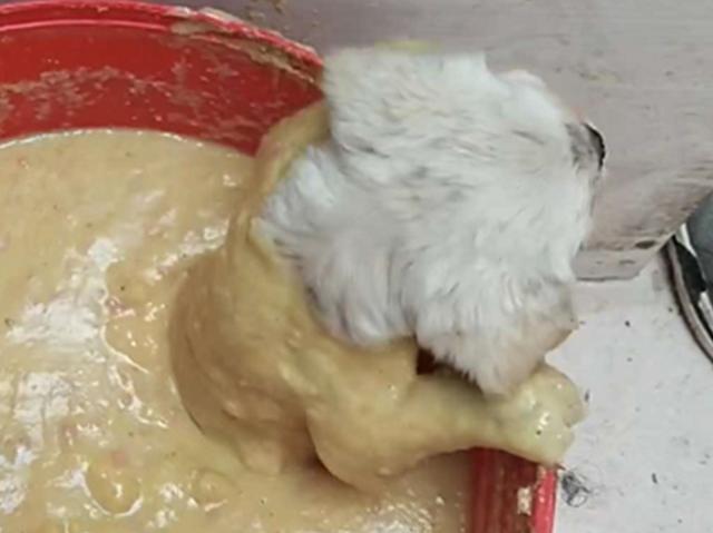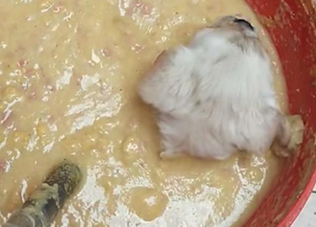 狗狗原来跳进了汤羹里,狗狗可能在想,女孩给它的食物太少了,根本没有办法诱惑得了我,而等女孩出门以后,狗狗竟偷偷的跳进了汤羹中享乐,可惜没有想到的是,自己吃太多,导致想爬出来时肚子给卡住,爬不出来了。