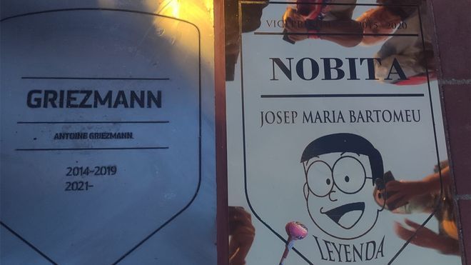 今天凌晨,巴萨客场0-2输给了马德里竞技,球队最近6场仅仅赢下1场。马竞与巴萨的比赛前,马竞球迷在马竞传奇大道的格列兹曼牌匾旁,放置了一块自制牌匾,上面写道:“副主席大雄,约瑟普·玛利亚·巴托梅乌,2015-2020”。这块牌匾上记载了巴托梅乌在担任巴萨主席时的所有操作,包括出售比利亚、购买格列兹曼和放走苏亚雷斯...巴托梅乌自2020年10月卸任巴萨主席以来,至今仍未公开露面。