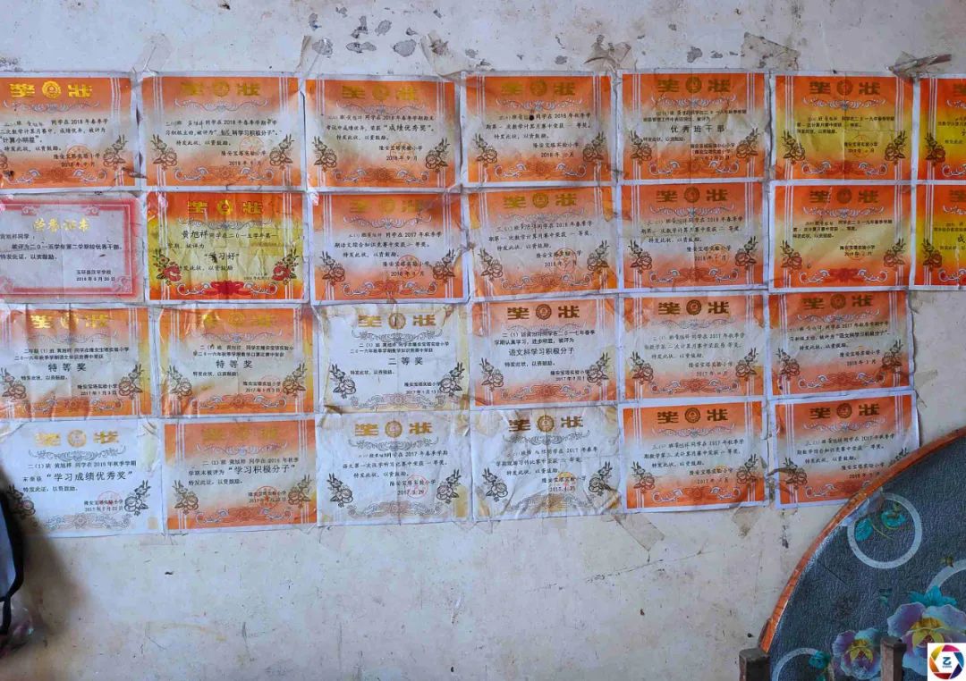 黄积博一家来自广西隆安县城厢镇旺中村,他的儿子旭祥从小热爱学习,性格活泼开朗,在班上成绩名列前茅。家中破旧的房屋一方颓圮的土墙上,整整齐齐地贴满了旭祥大大小小的奖状。“语文知识竞赛特等奖”、“数学口算特等奖”、“校优秀干部”、“学习成绩优秀奖”等等,总共有26份之多。这些奖状使得这面灰墙熠熠闪光,旭祥也一直以来都是这个清贫农村家庭的骄傲。